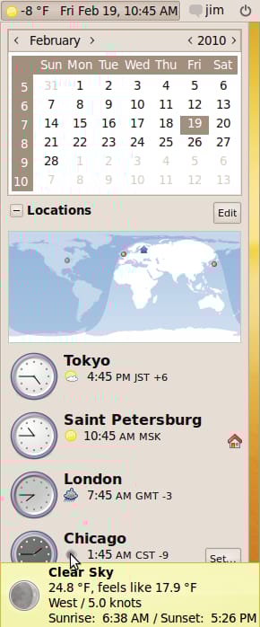 At some point, Gnome added the weather and multiple time zones to the standard clock panel widget. This allows me to always see the full date, time, and weather conditions in the top-right corner of my desktop. If I click on the date, I’m presented with a calendar, events from Evolution or Google Galendar, and the time and weather conditions in any city that I’ve added to my list. This is far more convenient than pushing F12 all the time on the Mac and waiting for the Dashboard to appear. Of course, the dashboard can do much more than this, but for my needs, Gnome panel widgets do everything I want.