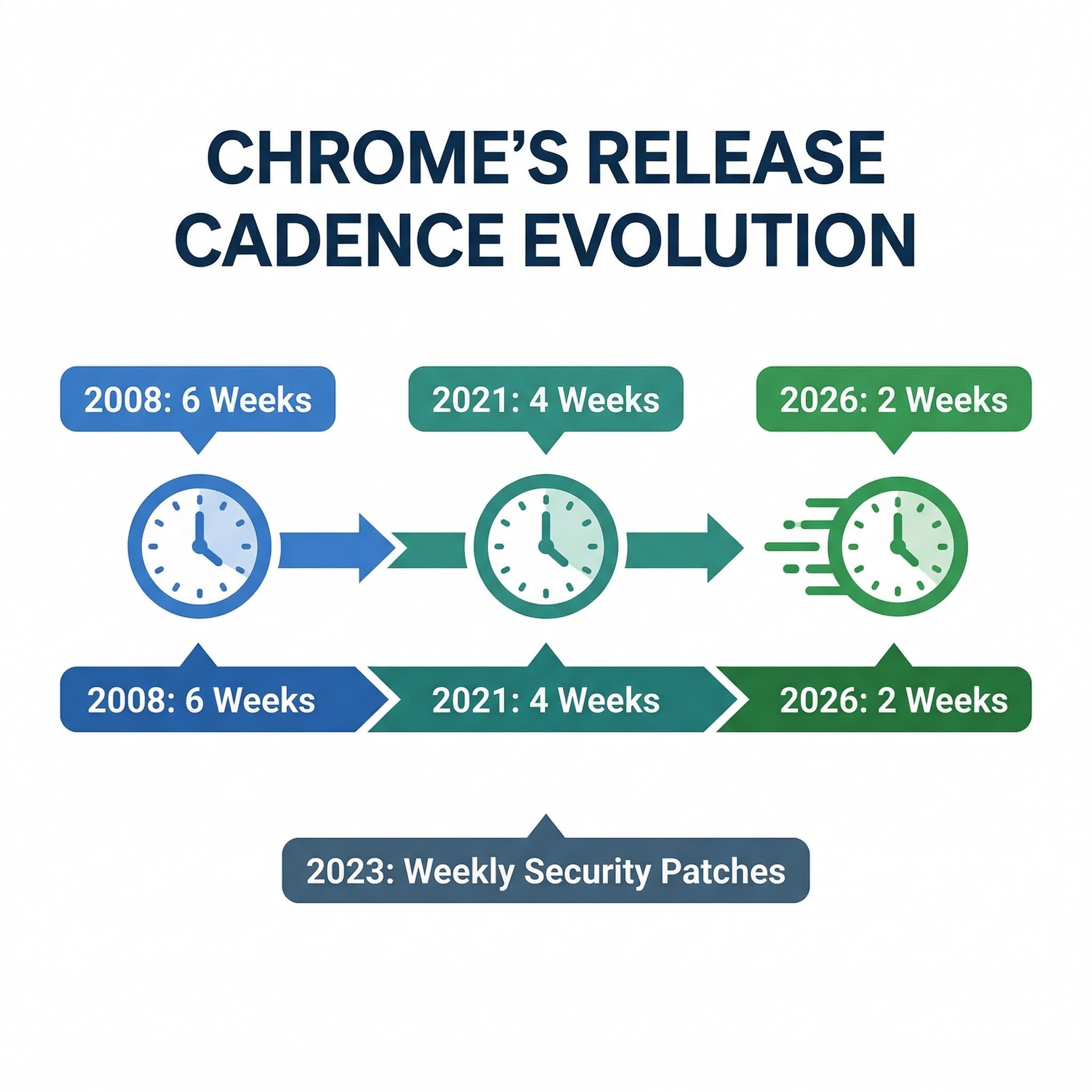Chrome’s release cadence has been a one-way ratchet since the browser launched. The original six-week cycle, introduced in 2008, was revolutionary at the time. Internet Explorer was still shipping major versions years apart, and Firefox was on a similar timeline. Chrome’s rapid-fire updates normalized the idea that browsers could just quietly improve themselves without asking users to download and install anything.