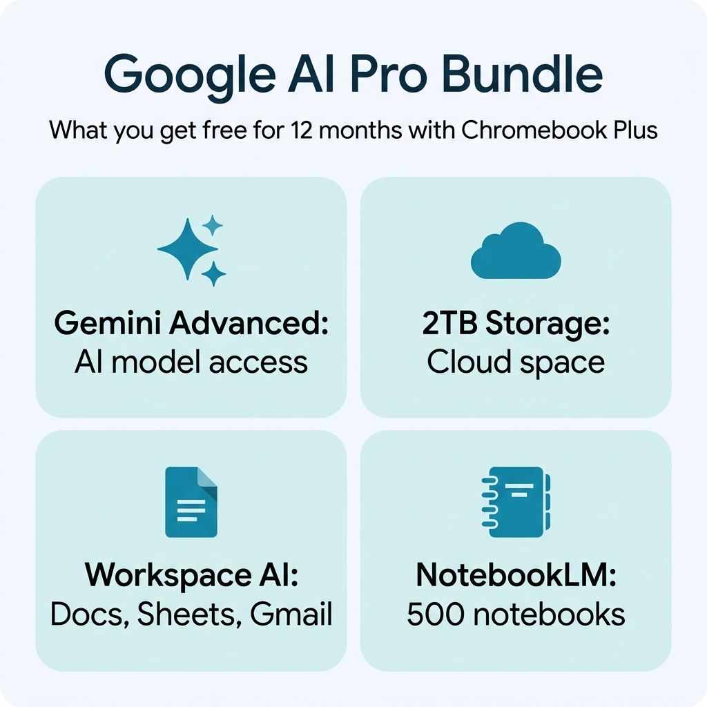 We already compared the MacBook Neo to Chromebooks on hardware, and the verdict was nuanced: Apple’s $599 laptop is genuinely impressive for creative work, but most students and cloud-first users are better served by a Chromebook Plus at half the price. What we didn’t account for in that analysis was Google’s counterpunch. Starting in mid-2025, every new Chromebook Plus from every major manufacturer ships with 12 months of Google AI Pro at no additional cost. That’s a subscription Google normally charges $19.99 per month for, and it includes Gemini Advanced, 2TB of cloud storage, and AI capabilities baked into Gmail, Docs, Sheets, and the rest of Google Workspace.