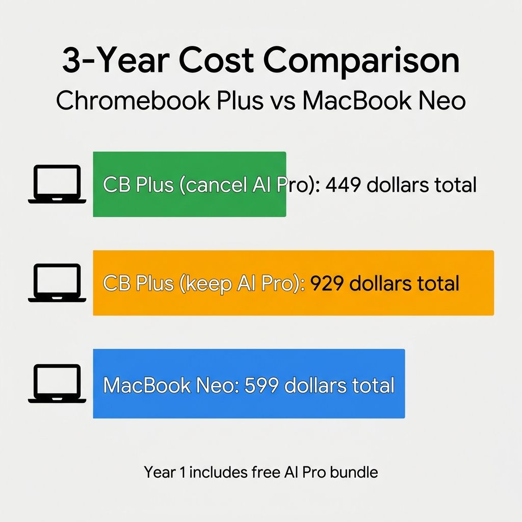 This creates three realistic scenarios for a buyer evaluating the total cost over three years. In the first scenario, you keep paying for AI Pro. A $449 Chromebook Plus costs $449 in year one, $240 in year two, and $240 in year three, for a total of $929. In the second scenario, you cancel after the free year. Total cost is $449, period, but you lose the cloud storage and AI features that may have become part of your workflow. In the third scenario, a MacBook Neo buyer pays $599 with Apple Intelligence permanently free. No subscription decisions, no storage downgrades, no calendar reminders.