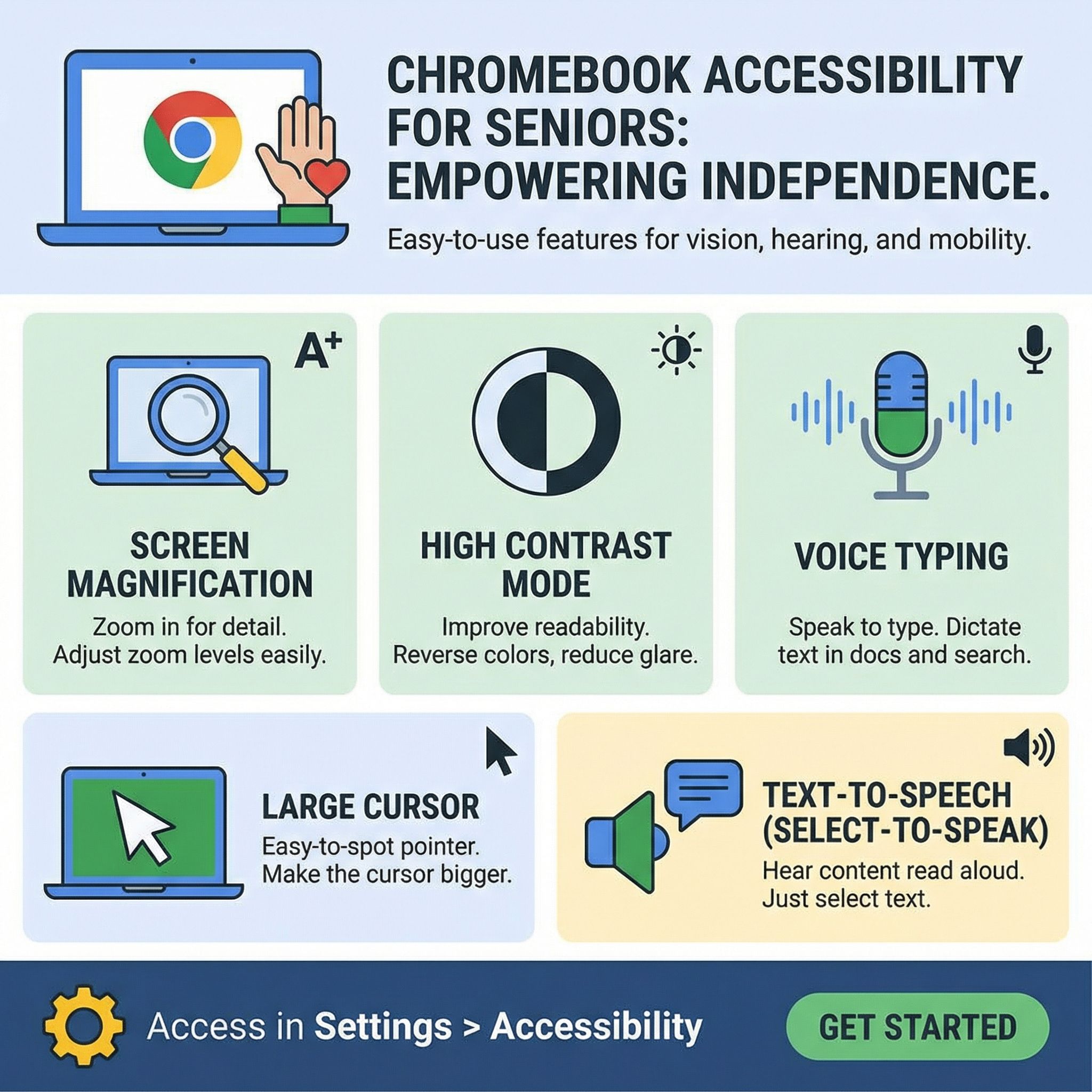 ChromeOS includes robust accessibility features that many seniors don’t know exist, and wouldn’t think to enable themselves. These aren’t just for users with disabilities—many address the normal vision and motor changes that accompany aging. Spending fifteen minutes configuring these during initial setup saves countless squinting sessions later.
