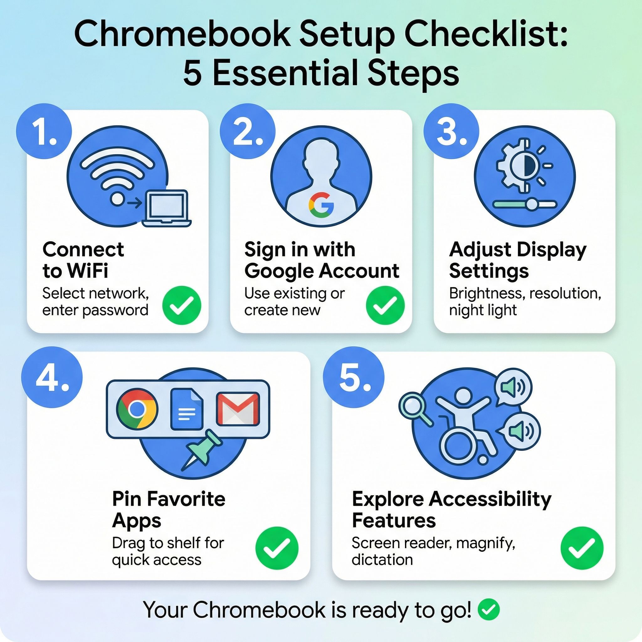 During initial Chromebook setup, the device asks about language, keyboard layout, and WiFi. Choose these carefully—a wrong language setting creates confusion that’s hard to undo without your help. Connect to their home WiFi during setup rather than skipping this step. When prompted to sign in, use the Google account you created or your parent’s existing one. Decline offers for trial subscriptions and optional features; these create confusion and potential future charges.