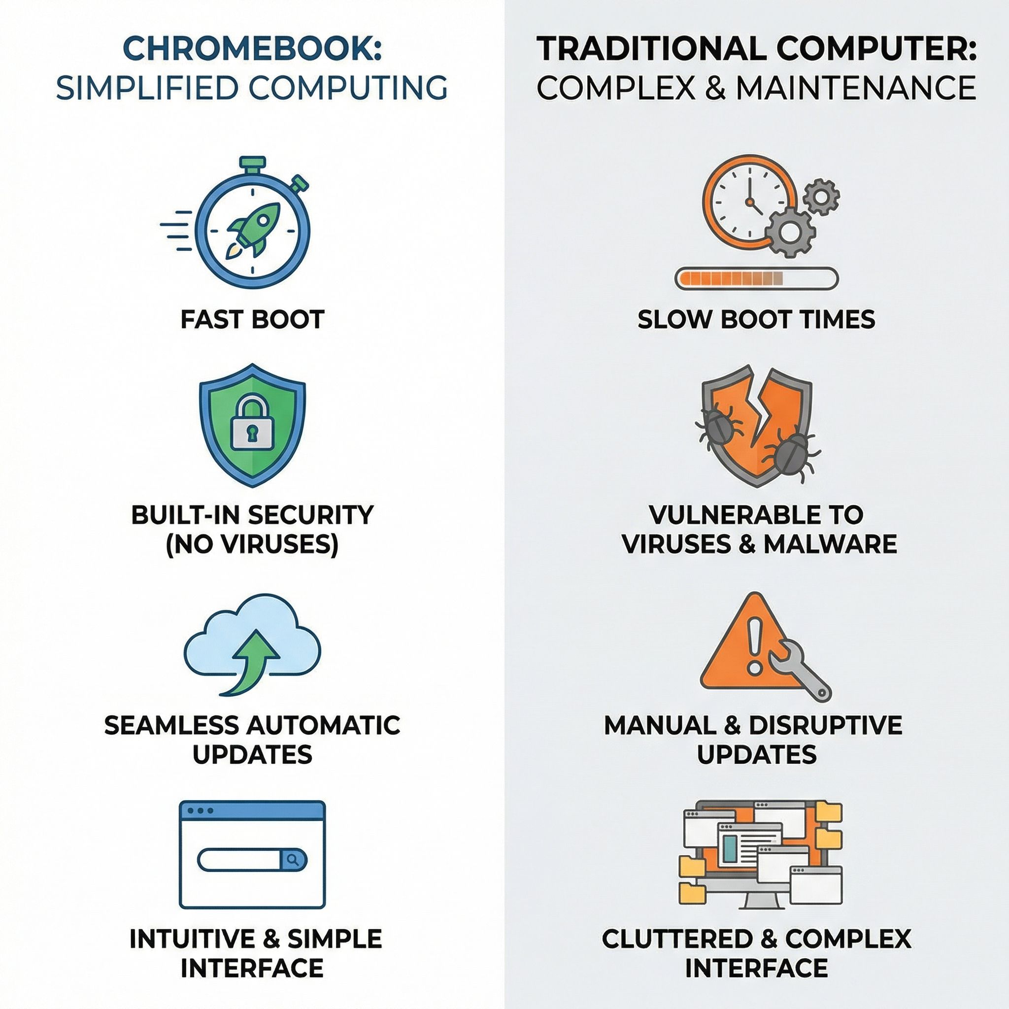 Chromebooks have quietly become the solution that tech-savvy adult children recommend to each other. Not because they’re the most powerful computers, but precisely because they’re not. When MakeUseOf explored why Chromebooks work for seniors, they identified what many of us discovered independently: simplicity isn’t a limitation for elderly users—it’s the feature. A computer that boots in seconds, updates itself invisibly, and can’t easily be infected with malware isn’t “dumbed down.” It’s exactly what most seniors actually need.