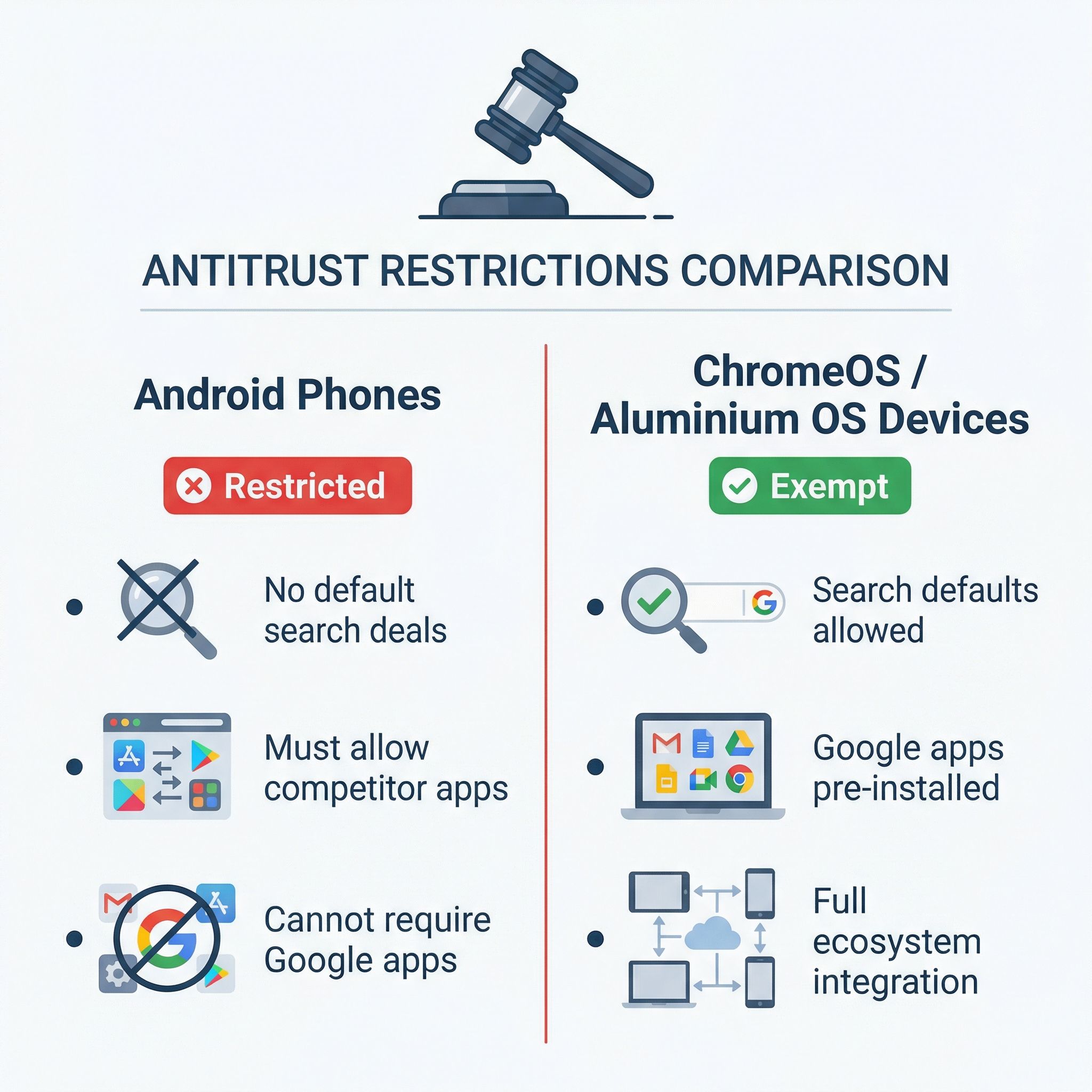 Read that again carefully. Aluminium OS is described in the court documents as “ChromeOS built on the Android stack.” If it qualifies as a ChromeOS successor, then Aluminium OS laptops and desktops could ship with Google Search locked in as the default, Google apps pre-installed without competitor alternatives, and Gemini deeply integrated at the system level. These are exactly the practices the court is trying to restrict on Android phones.