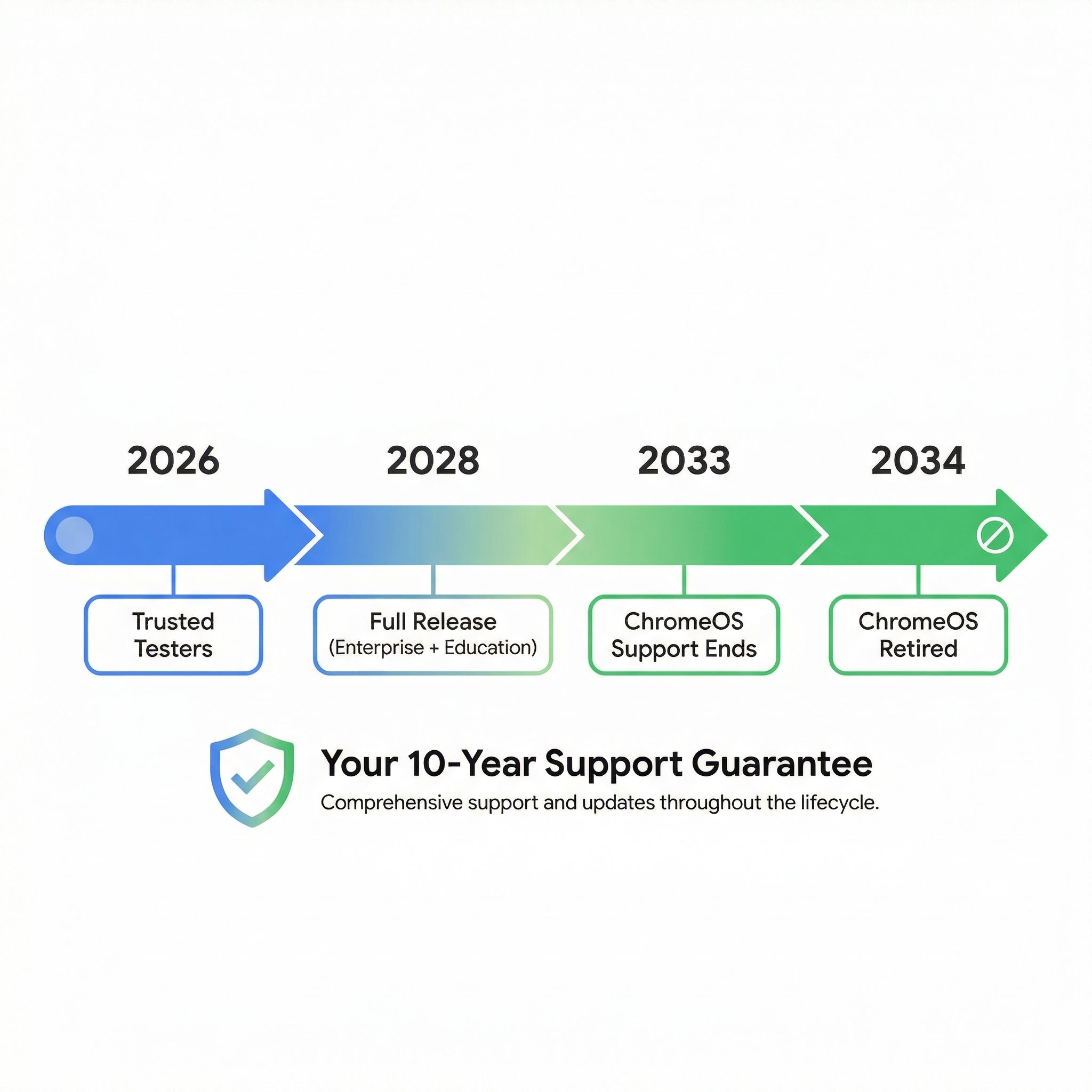 The key facts: Google’s lawyers confirmed that the “timeline to phase out ChromeOS is 2034.” That date isn’t arbitrary. Google is legally and contractually obligated to maintain ChromeOS “at least through 2033 to meet its 10-year support commitment to existing users.” Once the last supported Chromebook reaches its end-of-life date, ChromeOS as we know it will be retired. The replacement, Aluminium OS, will be offered to “commercial trusted testers” in late 2026, with a full release not expected until 2028.