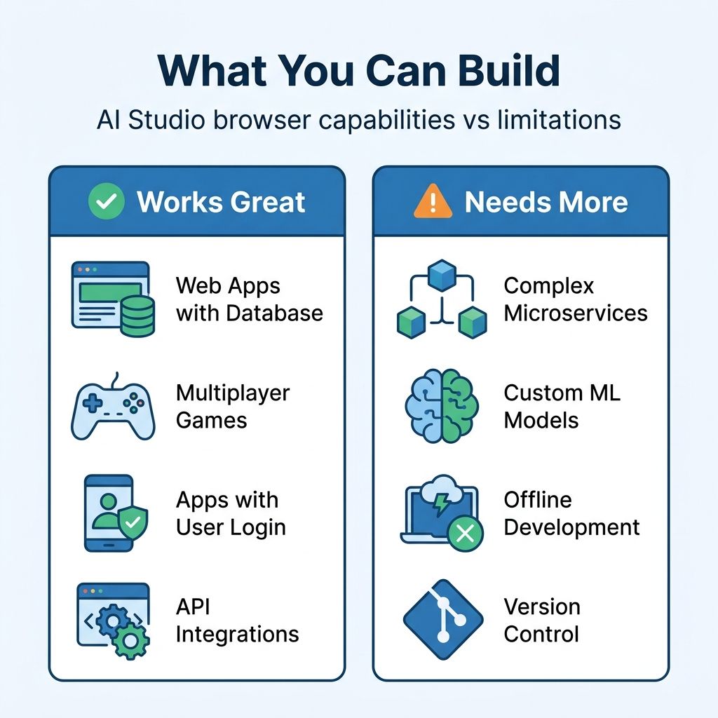 The enthusiasm needs tempering with honesty, because AI Studio’s browser-based vibe coding has real boundaries. The tool excels at prototyping and building straightforward web applications — the kind of app that has a frontend, a database, maybe some authentication, and interactions with a few APIs. For a student building their first project, a teacher creating a classroom tool, or a non-developer turning an idea into a working prototype, this is genuinely transformative.