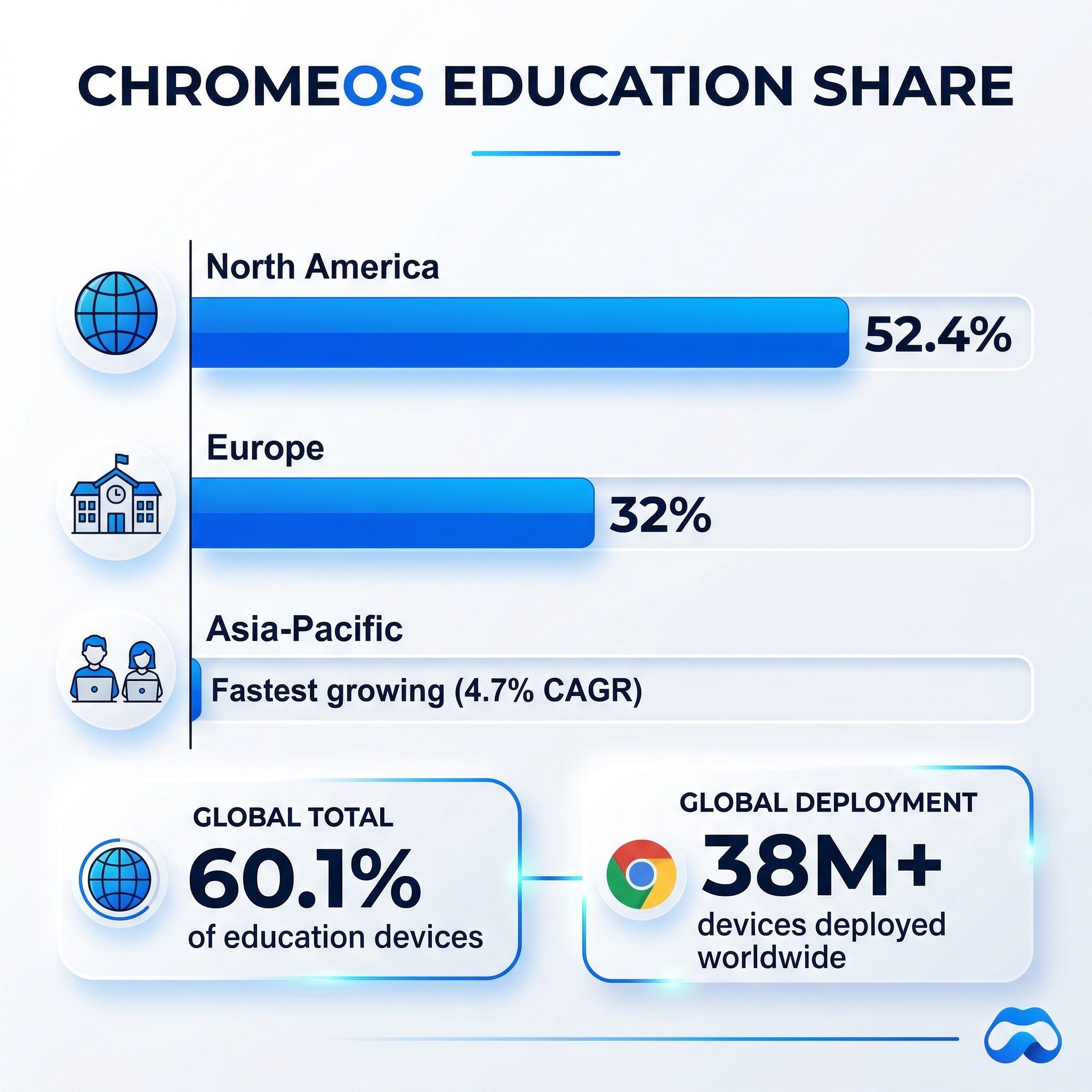Japan’s GIGA program did not create Chromebook’s education dominance. It confirmed it. ChromeOS now commands 60.1 percent of the global education device market, with more than 38 million Chromebooks deployed in K-12 schools worldwide. That number has been building for over a decade, but the geographic breadth of adoption has accelerated in ways that even close observers of the market may not fully appreciate.