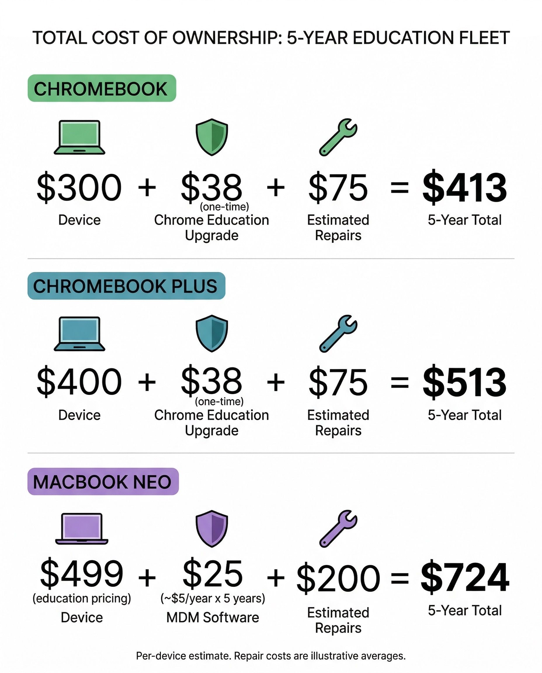 The consumer pricing story is one thing. The education fleet story is entirely different, and this is where the “Chromebook killer” narrative falls apart fastest. Schools don’t buy laptops one at a time. They buy hundreds or thousands of devices, deploy them across buildings, manage them remotely, lock them down for testing, and maintain them for years on tight budgets.