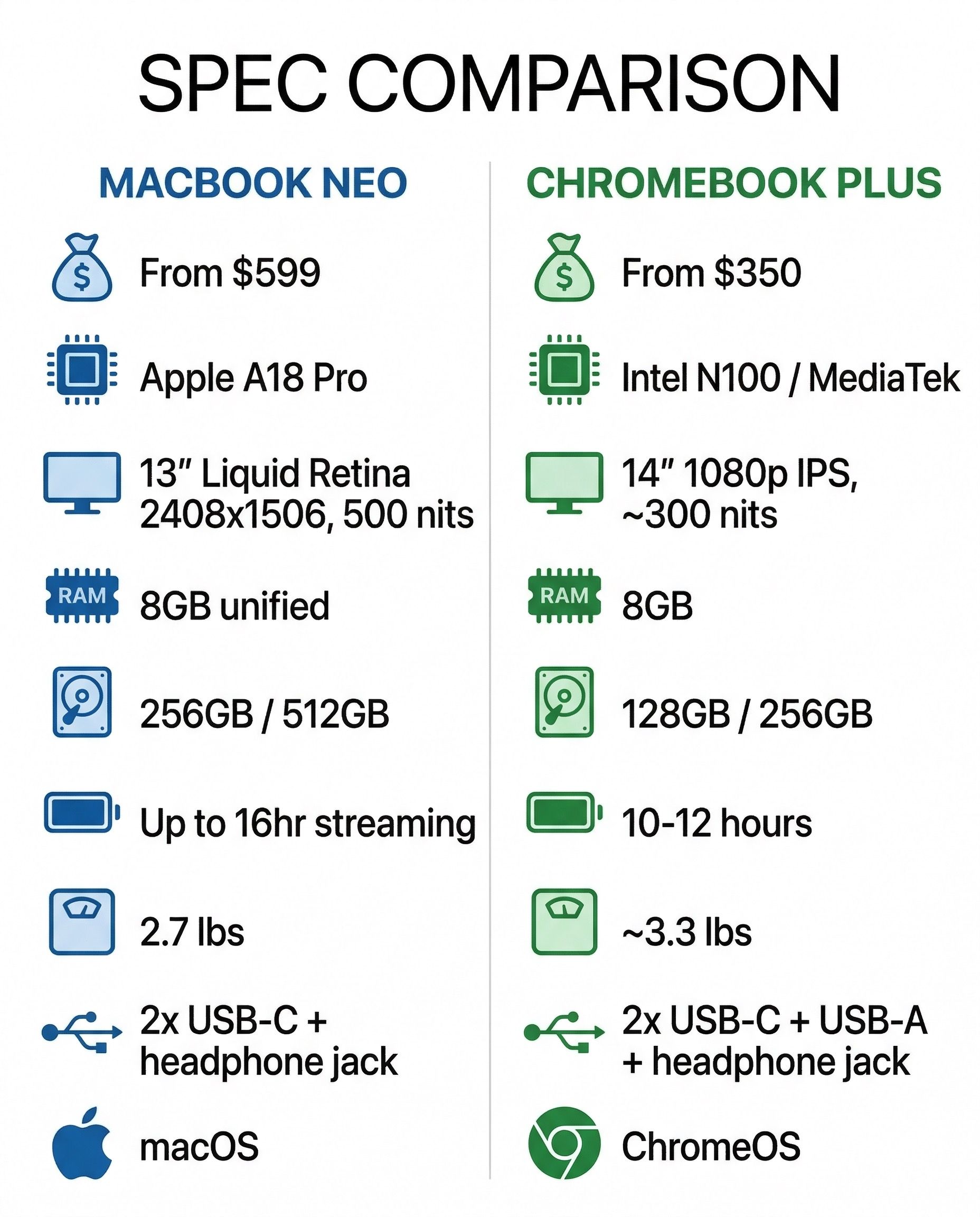 The MacBook Neo’s spec sheet reads like it was designed to make Chromebook Plus models look overpriced. Apple’s A18 Pro processor, originally built for the iPhone 16 Pro, delivers roughly 3.3 times the single-core performance of the Intel N100 chips powering most mid-range Chromebooks, based on Geekbench 6 scores. The 13-inch Liquid Retina display runs at 2408x1506 pixels with 500 nits of brightness, which is sharper and brighter than anything you’ll find on a Chromebook under $700. Apple claims 16 hours of battery life for video streaming, and if it follows the pattern of previous Apple Silicon machines, real-world battery life should come reasonably close to that number.