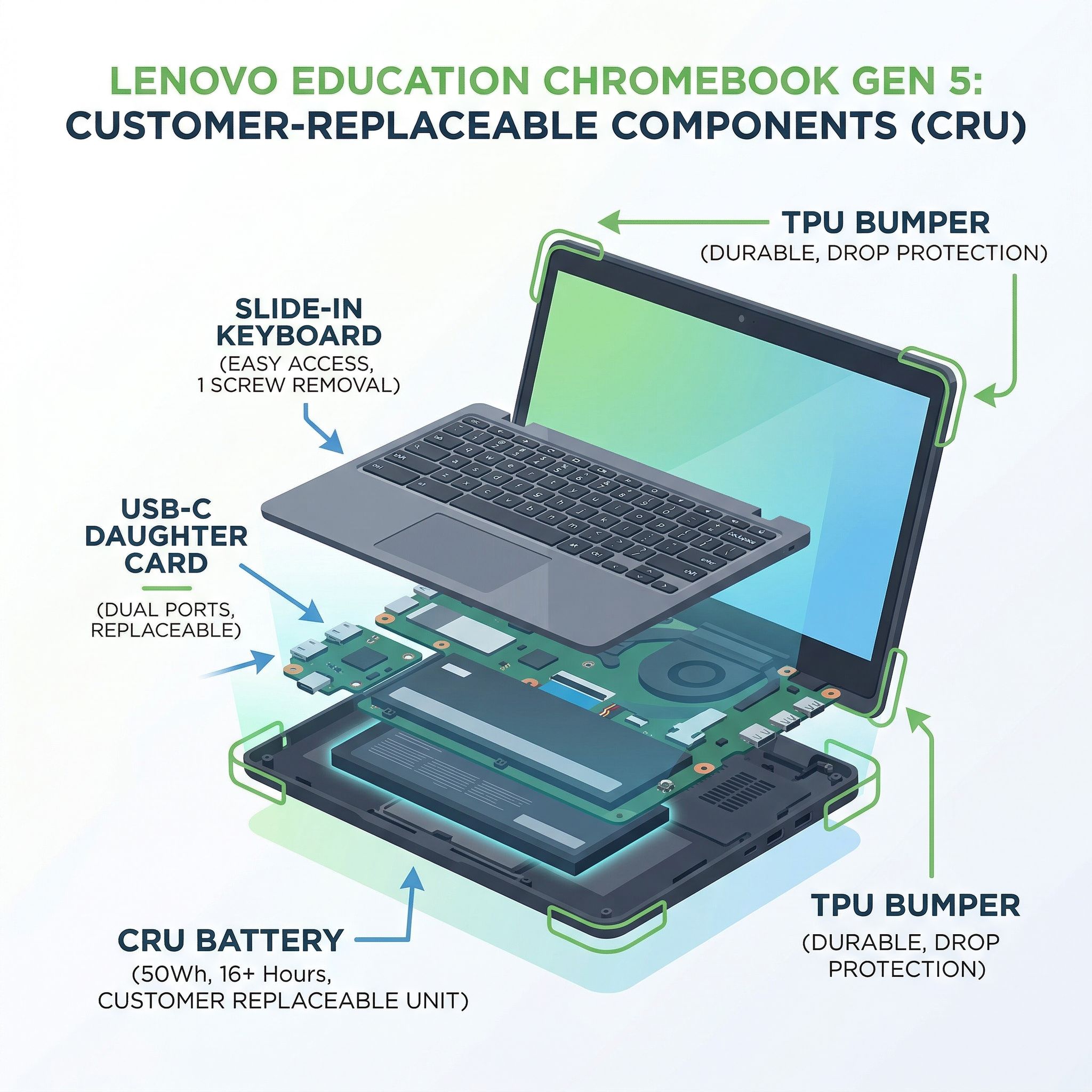 Now there’s a hardware answer. At FETC 2026, Lenovo unveiled the Chromebook 100e Gen 5 and 500e 2-in-1 Gen 5 with what the company calls a “Customer Replaceable Unit” design philosophy. The idea is straightforward: instead of requiring schools to send broken devices to depot repair or replace entire motherboards when a single port breaks, CRU-designated components can be swapped out by school IT staff on-site, without voiding warranties, without specialized tools, and without weeks of downtime. It’s the kind of thing that should have been standard years ago, and the fact that it’s being treated as a breakthrough tells you a lot about how education Chromebooks have been designed until now.