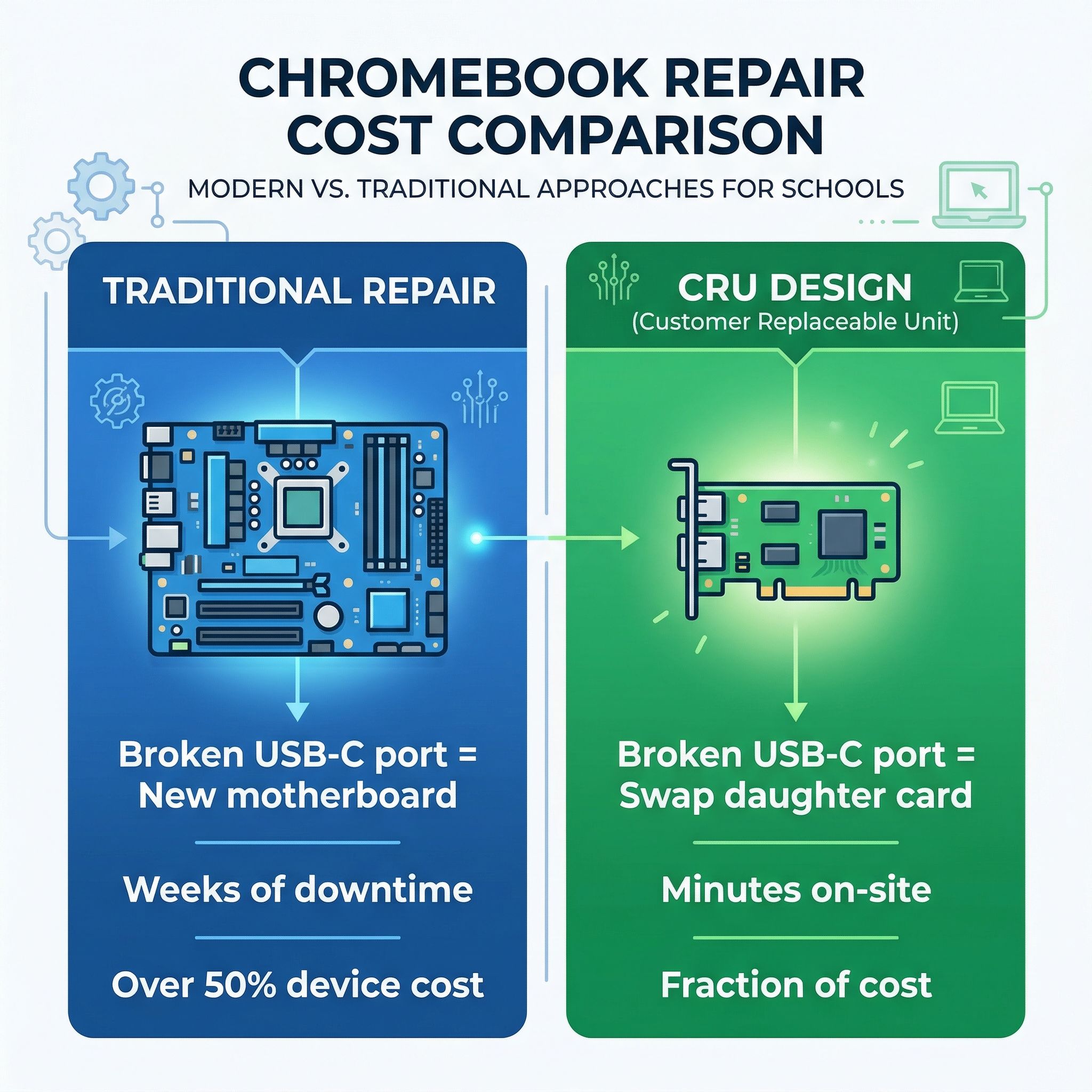 Second, does a broken USB-C port require motherboard replacement? This is the single most expensive common repair in education Chromebooks, and it’s the repair that the Gen 5’s daughter card design eliminates. If the answer is yes, factor the cost of motherboard replacements into your total cost of ownership calculation.