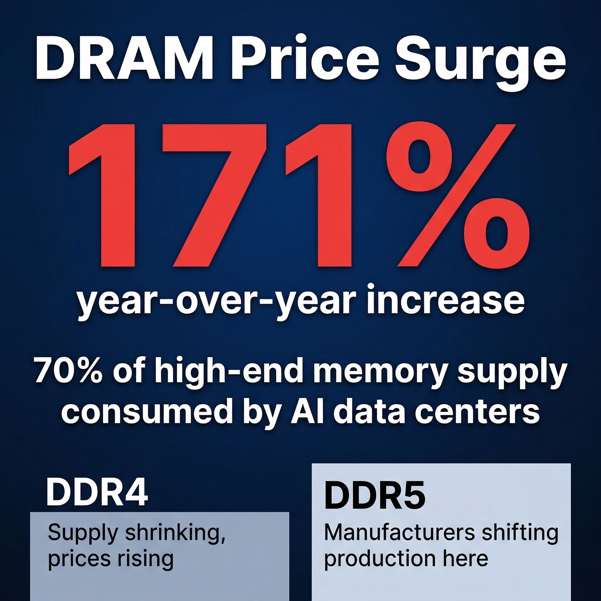 The root cause is straightforward even if the consequences are complex. AI companies are consuming enormous quantities of memory chips. Modern large language models and the GPU clusters that run them require vast amounts of both conventional DRAM and specialized high-bandwidth memory. When NVIDIA, AMD, and their cloud computing customers began scaling AI infrastructure in earnest, they triggered a demand spike that memory manufacturers weren’t prepared to absorb. Industry analysts estimate that AI data centers could consume roughly 70% of high-end memory supply in 2026, leaving the remaining 30% for every other device category.