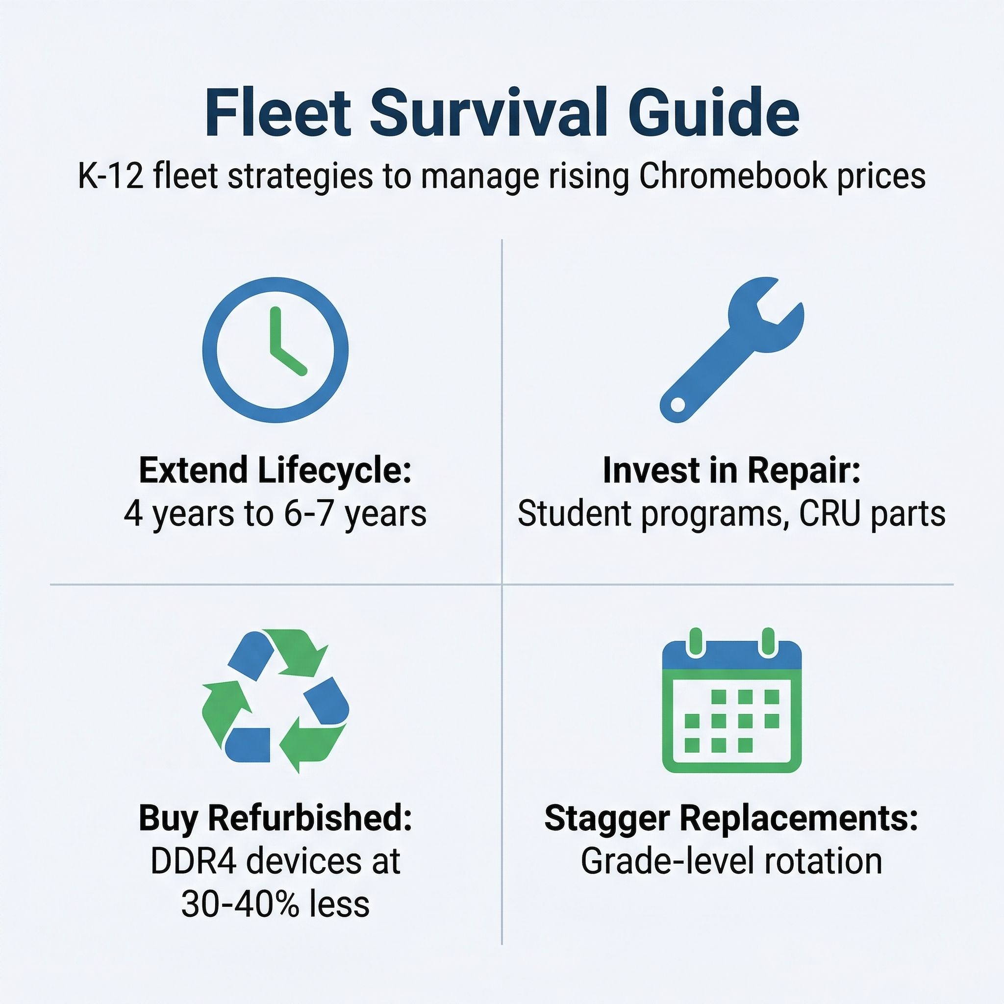 The conversations happening in school IT communities right now are remarkably pragmatic. Rather than waiting for prices to drop, something industry analysts don’t expect to happen before 2027 or 2028, districts are adapting their fleet strategies in several concrete ways.