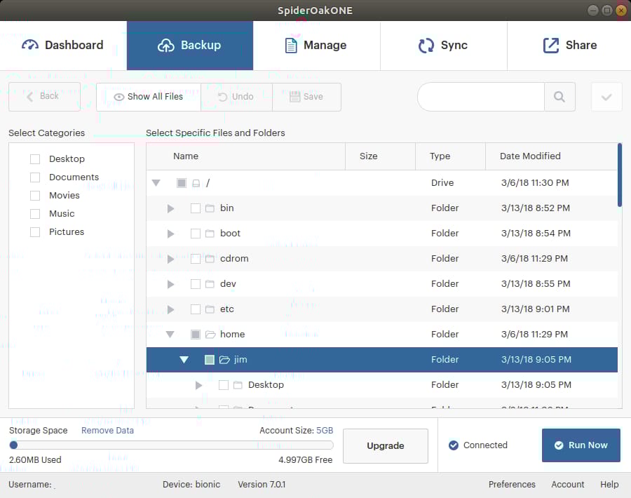 SpiderOak One is a multi-platform cloud service that you can use for making secure online backups. SpiderOak offers folder syncing and sharing features along with backup and has a real focus on security and privacy. SpiderOak One clients are available for Linux, macOS, Windows, iOS, and Android. Pricing starts at $5/month for 150 GB of storage and goes all the way up to 5 TB of storage for $25/month.