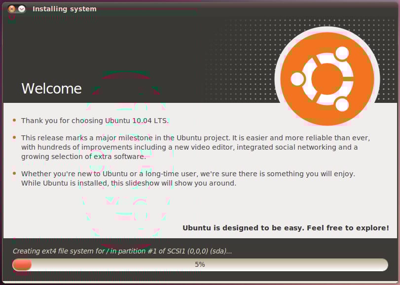 The new installer CD no longer displays a text-based screen at startup. Instead, it boots into a full graphical environment before asking if you want to “try” or “install” Ubuntu. The installer wizard is pretty much the same, only with small visible changes. Once the installation process has started, however, you’ll be treated to a fabulous new slide show, a tour of sorts, that tells you about all the features of Ubuntu.