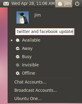 Brand new in Ubuntu 10.04 is the Me Menu. This new menu is your one-stop place for quick interaction with your social networks and chat accounts. You can quickly update your Twitter or Facebook status right from the Me Menu. This eliminates the need to launch Firefox and load Facebook or Twitter if you just want to send off a quick status update. Chat status settings have also been moved into the Me Menu. Finally, the Me Menu provides quick access to settings for your social networks, chat accounts and Ubuntu One.