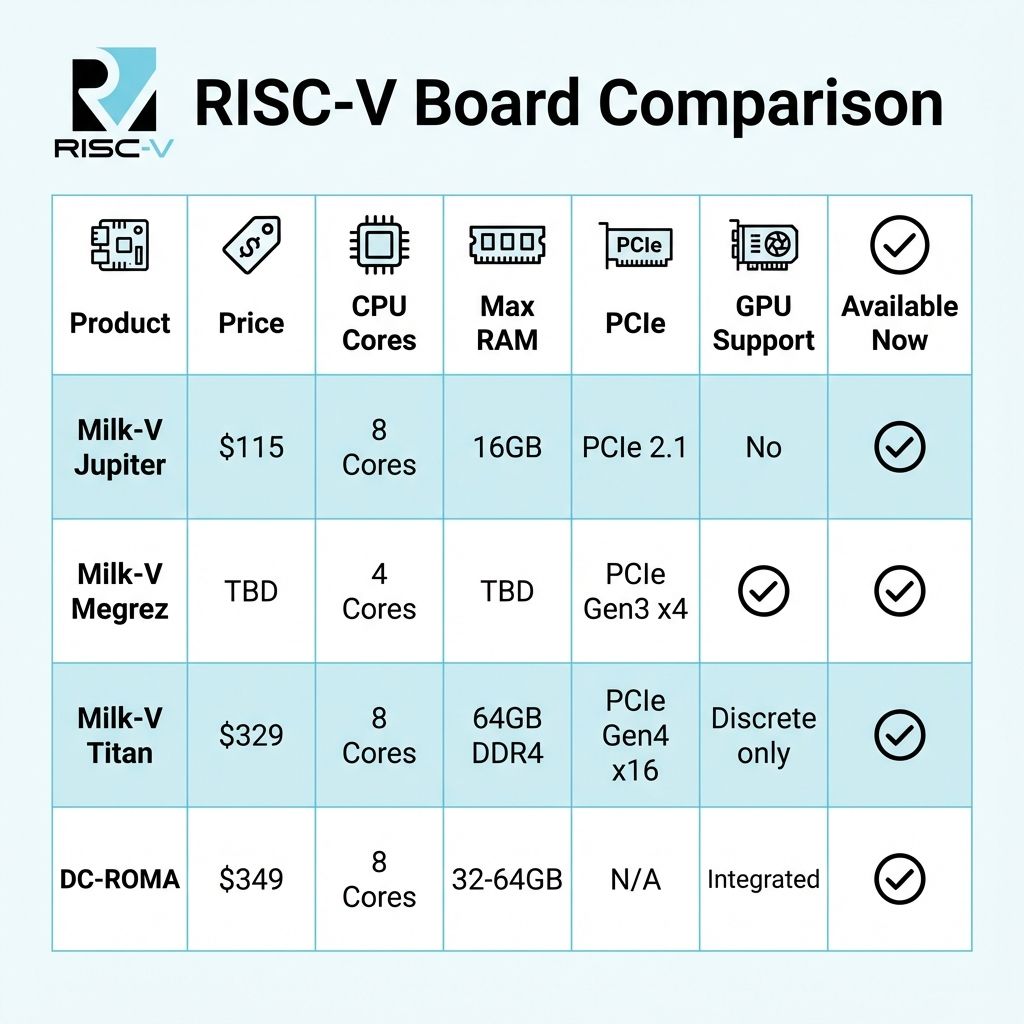 The strongest recommendation in the current lineup depends on your budget and goals. The Milk-V Jupiter at $115 (16GB M1 model) is the best starting point for experimentation: it’s cheap enough to justify as a learning tool, the Mini-ITX form factor makes it feel like a real PC, and the community around it is active and helpful. The Titan at $329 is the serious option for developers who need PCIe Gen4 bandwidth, DDR4 DIMM flexibility, UEFI boot, and the closest thing to a standard PC experience that RISC-V currently offers. The DeepComputing DC-ROMA at $349 is the most turnkey option, arriving pre-assembled with Ubuntu and 32GB RAM. Just keep in mind that Titan requires adding a discrete GPU, so budget an extra $50-150 for a compatible card.