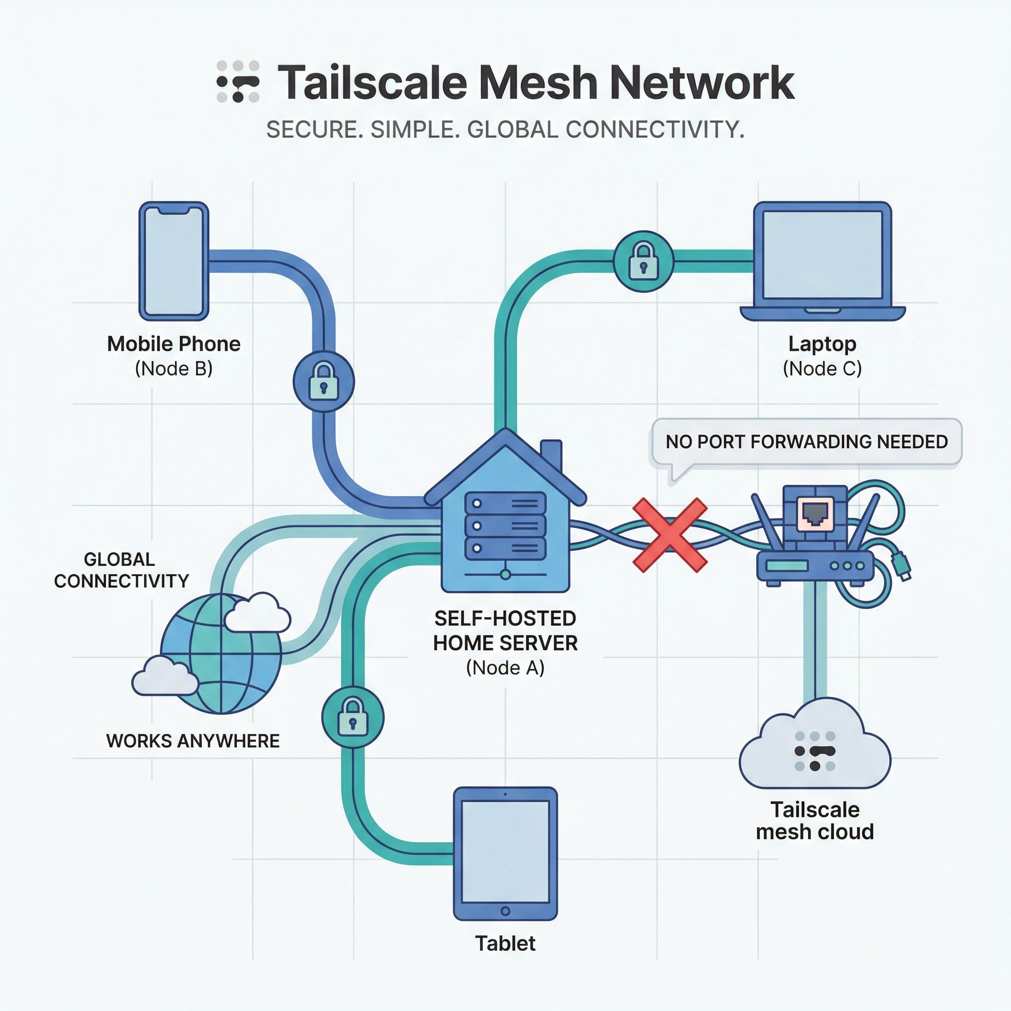 Tailscale solves essentially all of these problems by creating a private mesh network that works through NAT and firewalls automatically. No port forwarding required. No exposed services. No complex DNS configuration. You install the Tailscale client on your devices, join them to your network, and they can communicate with each other directly using WireGuard encryption, regardless of what ridiculous NAT situation your ISP or router has created. The free tier covers up to 100 devices, which is more than most home labs will ever need.