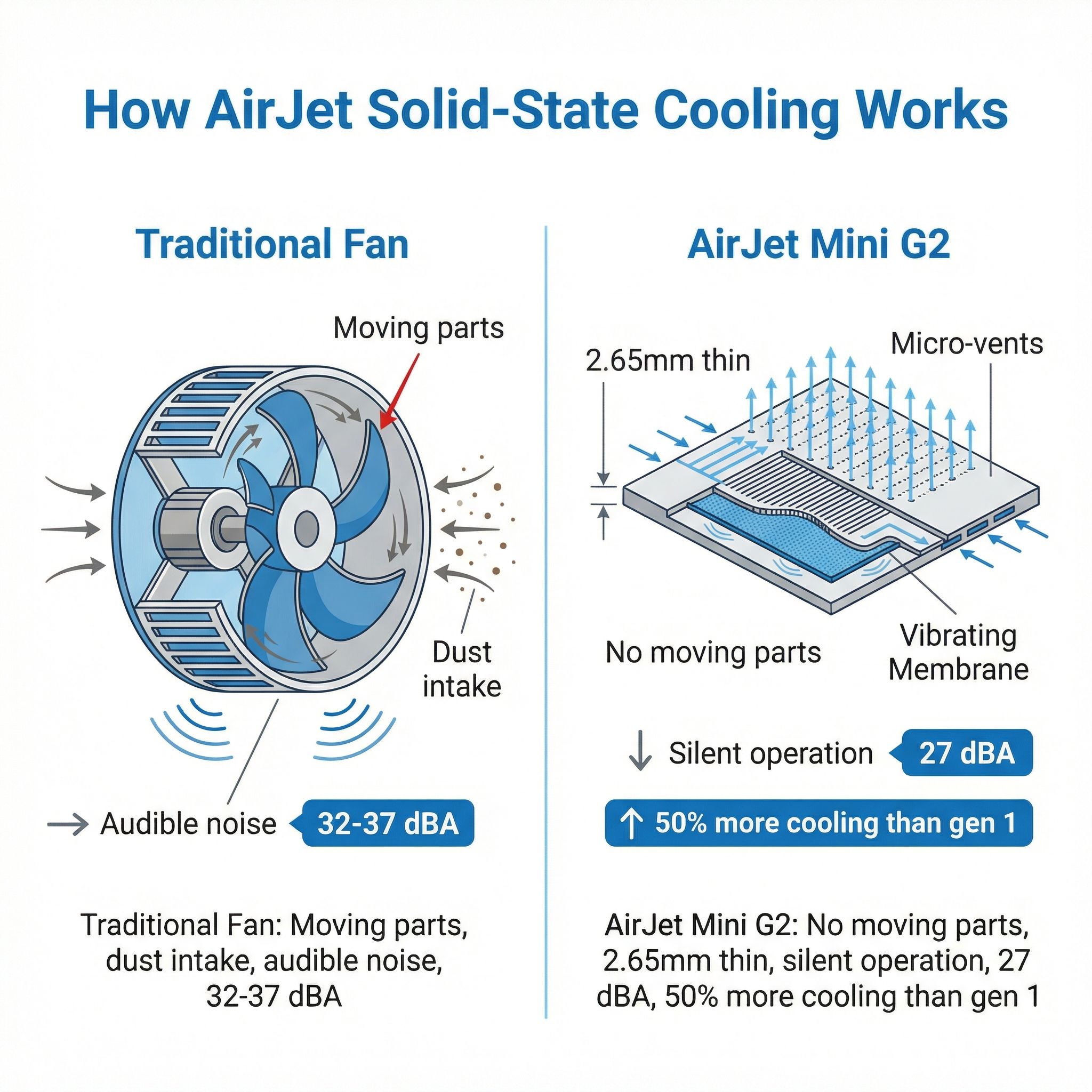 The second-generation AirJet Mini G2 removes 50% more heat than the original while maintaining the same ultra-compact footprint. In a Samsung Galaxy Book proof-of-concept at CES 2025, four AirJet Mini units replaced a dual-fan cooling system entirely. Cinebench tests showed the AirJet-cooled laptop actually ran faster than the fan-cooled version because the processor could sustain higher clocks without thermal throttling, all while running near-silently.