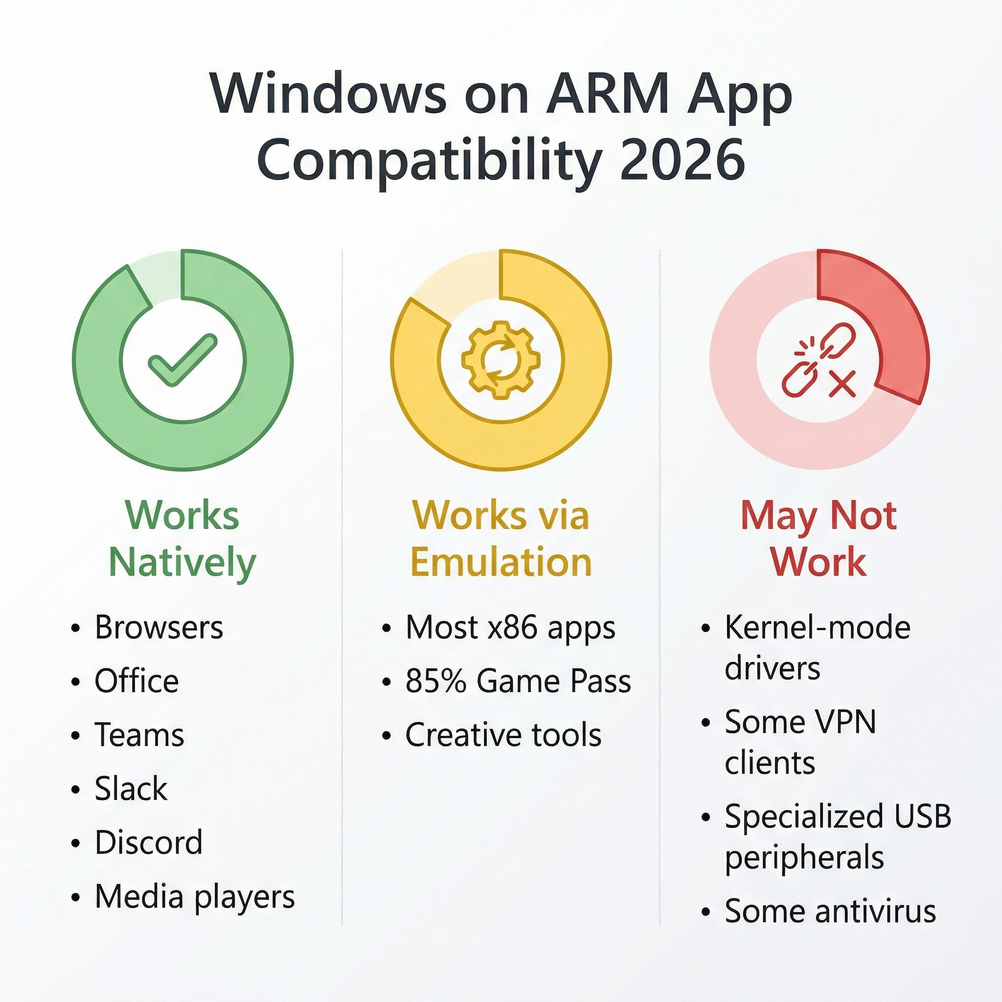 The single biggest concern people have about Windows on ARM is whether their software will actually work. The honest answer in early 2026 is: probably, with predictable exceptions. Microsoft’s Prism emulation layer translates x86 instructions to ARM64 code on the fly, and a major update in December 2025 added AVX and AVX2 support, dramatically expanding the list of compatible applications. Programs that previously refused to install, like Ableton Live 12, now run without issue.