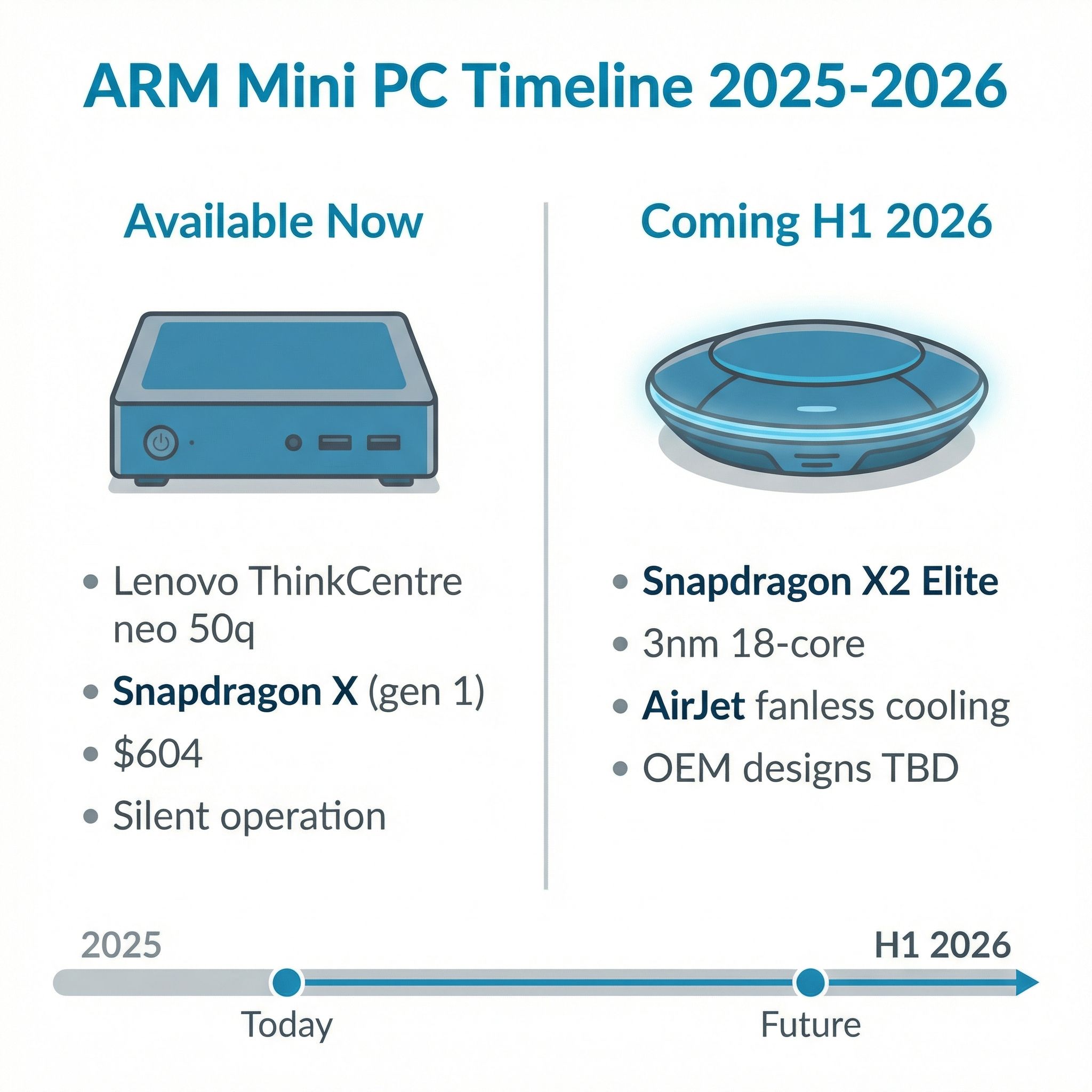 The timing matters. Microsoft released Windows 11 26H1 exclusively for ARM devices in February 2026, built on an entirely new codebase. The first ARM mini PC you can actually buy, Lenovo’s ThinkCentre neo 50q, has been shipping since late 2025 and earned strong reviews. And Qualcomm’s Snapdragon X2 Elite, built on TSMC’s 3nm process, is posting benchmark numbers that genuinely compete with Apple’s M5 in multi-threaded workloads. Something real is happening here, but the gap between prototype promise and daily-driver reality deserves honest examination.