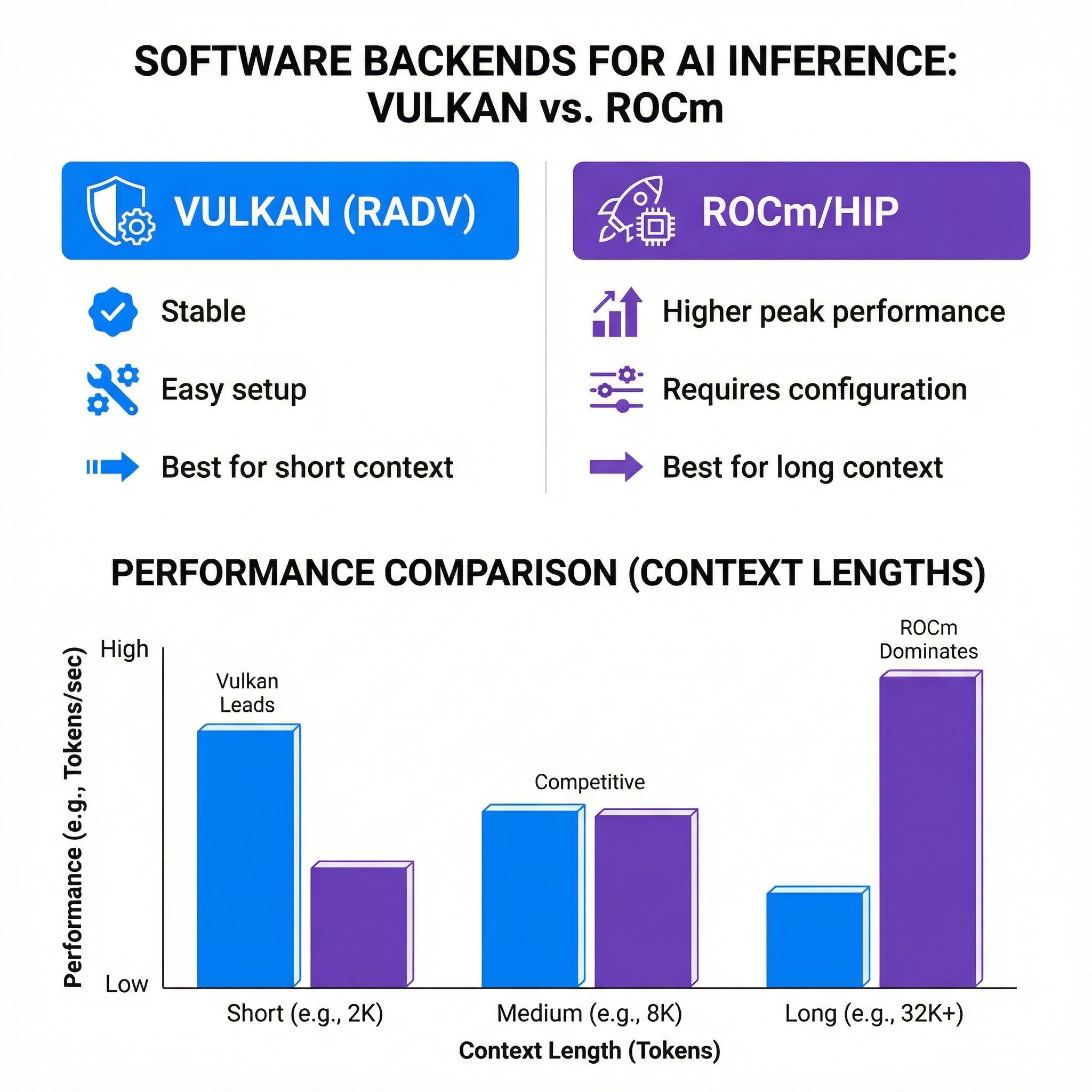 The situation becomes more nuanced when you’re working with long context windows. Vulkan performance degrades significantly as context grows beyond 4,000 tokens, while a properly configured ROCm setup with Flash Attention maintains consistent performance even at 8,000+ tokens. If you’re building RAG pipelines or doing document analysis that requires long context, ROCm is worth the setup pain.